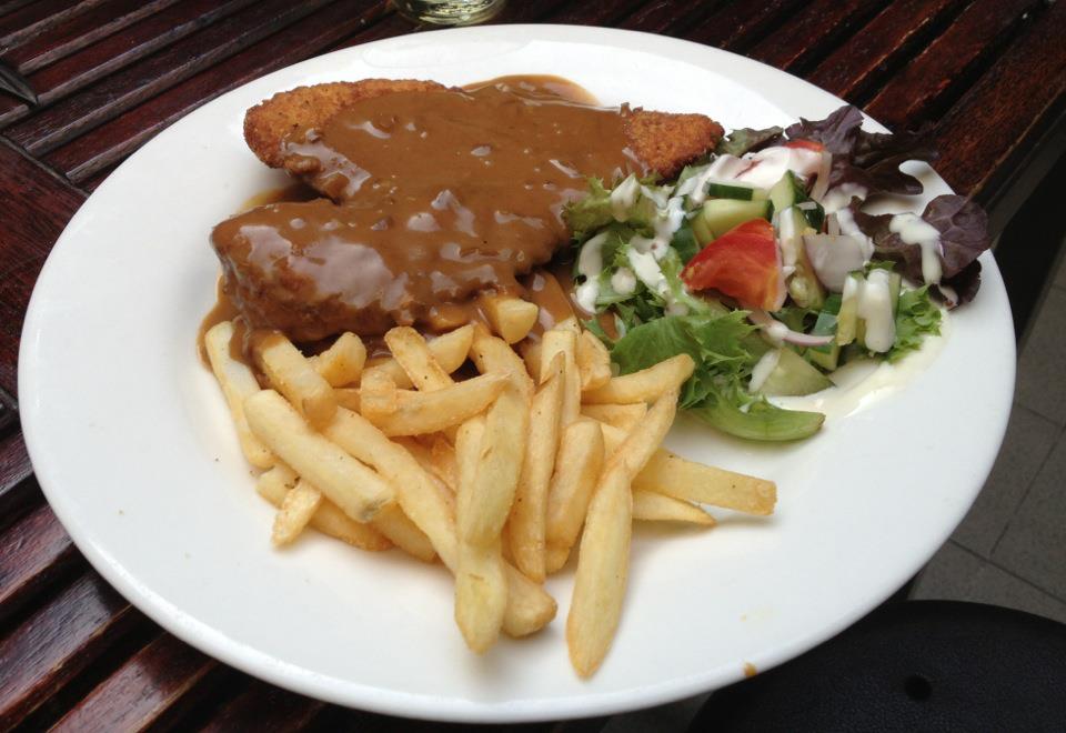 Today, I ordered the Chicken Schnitzel with Gravy. The meal came out 15 minutes after ordering and the meal was nicely presented. The schnitzel was tender and succulent, and the chicken was of an acceptable size. The gravy had a nice thick consistency and the chips could have been fried a bit longer. The vegetables were fresh and crisp, but I don’t know about the bland mayonnaise that was used.