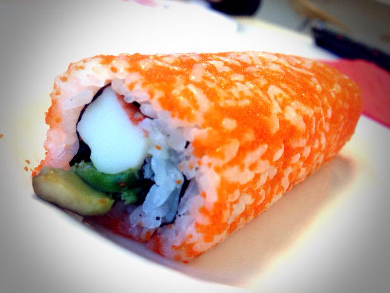 The sushi was really good. The sushi rice was soft and moist, and you could tell it was freshly made. The avocado was ripe, and was soft and creamy. The crab stick was processed flour and was there for decorative purposes. The flying fish roe that covered the sushi added a subtle sweetness.