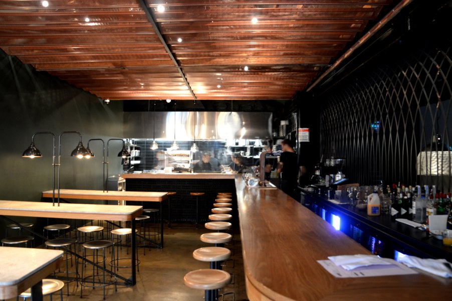The venue itself has a modern warehouse feel about it. The seating is a combination of communal benches and bar seating, with a long timber benchtop running down one side of the room. The kitchen is open plan and you can see the flames from the wood grill if you look closely enough. The ceiling is kind of exposed with what looks to be see through grates that are all angled in the same position. There’s not much natural light that flows through during the day, but if you sit close enough to the windows, you can get a bit of sunshine.