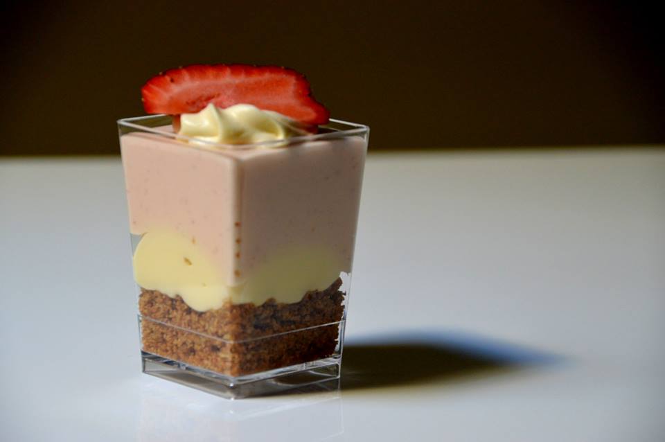 The dessert is essentially made up of 3 layers; the top being a mixture of creme fraiche, cream cheese and strawberries, the middle layer consisting of creme fraiche, cream cheese and vanilla extract and the bottom layer being crushed biscuits.