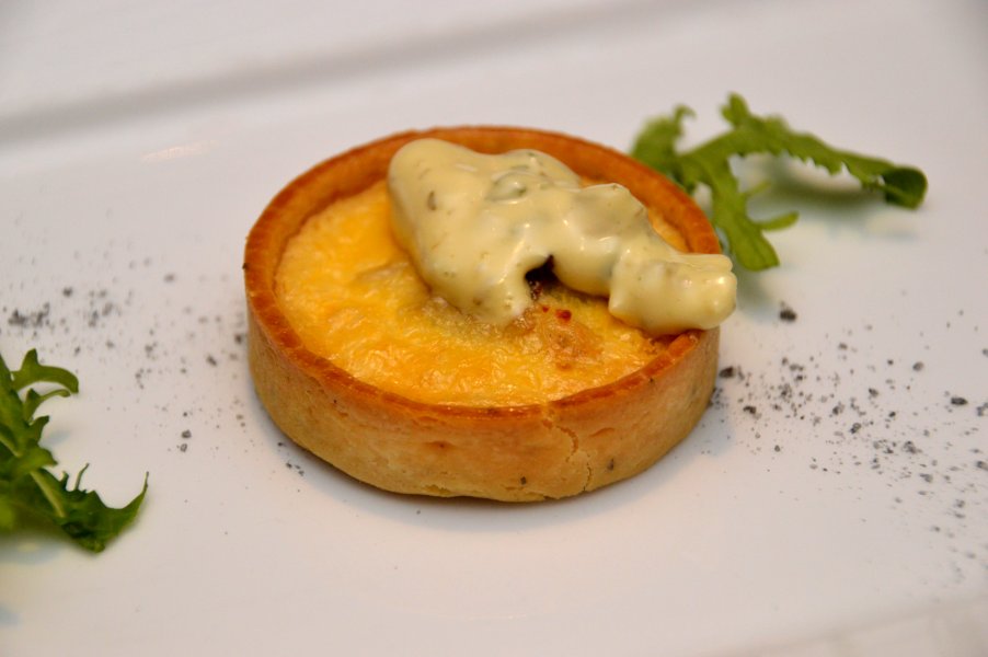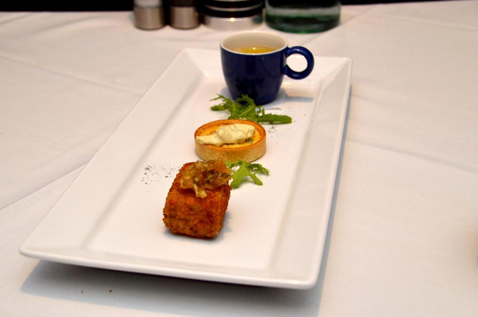 The Entree Tasting Platter consisted of (from front to back) Crumbed Pressed Pork with apple relish, Smoked Barramundi Belly and Caper Tart with gribiche, and Cauliflower, Fennel and Roast Garlic Soup.