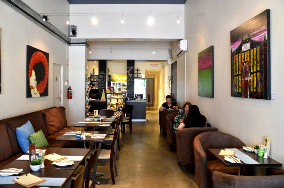 Set in a long skinny floor plan, the decor is neat and well presented with artworks for sale along the main walls. There’s not much natural light that flows through the frontage but there is still a casual relaxed vibe.