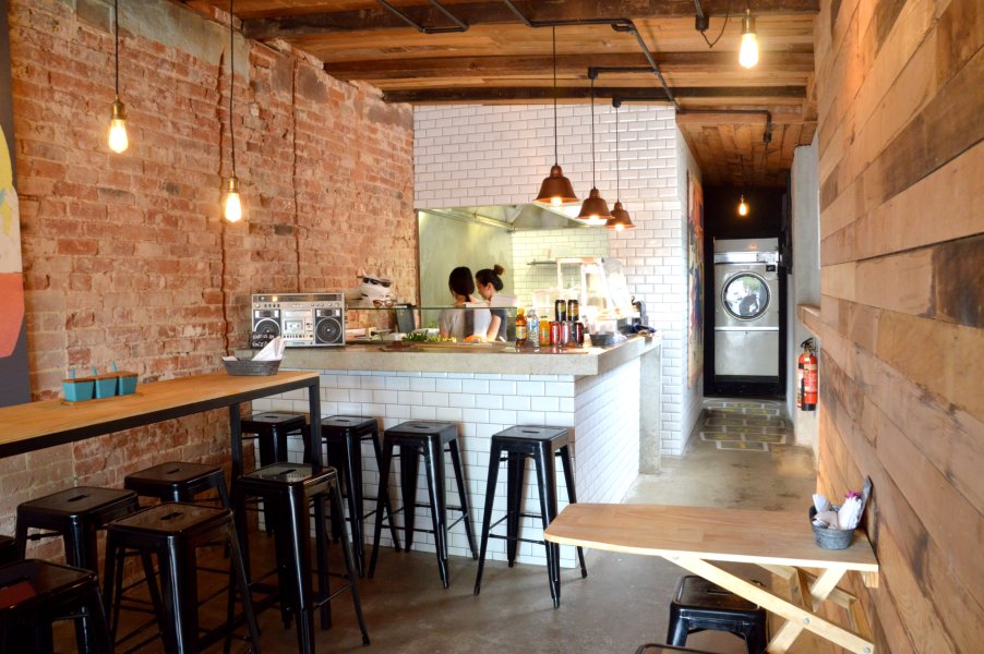 Timber cladding features quite prominently in this quaint little space, both inside and out. The polished concrete floors, exposed brick work and low hanging light fittings gives this place an industrial feel. The white tiling and the concrete benchtop complement the contrasting textures well. While the place is not overly large, there is sufficient seating both inside and out.