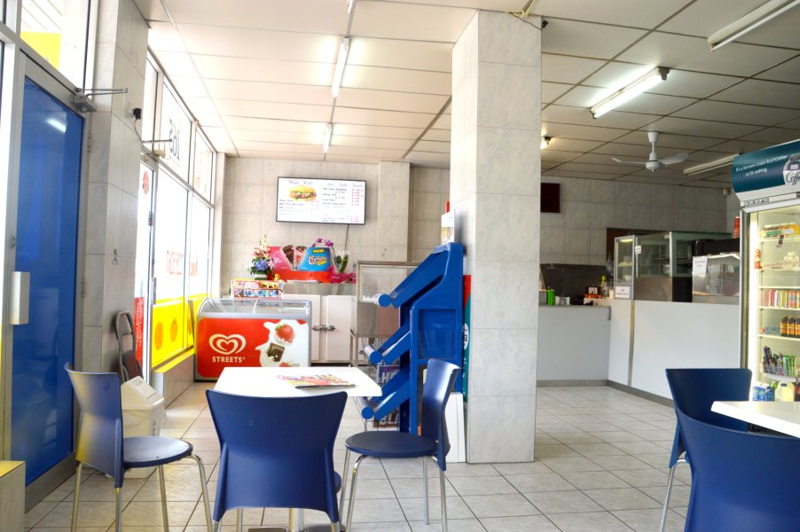The decor is fairly basic with a dated grey colour scheme. There are a couple of seats to one side of the room should you choose to dine in.