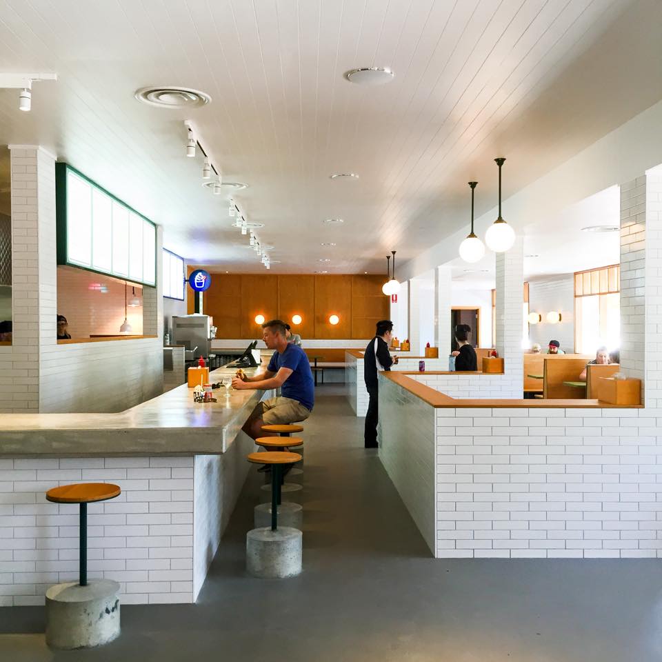 The Hindmarsh store is a lot larger than the one in Norwood. One of the main features is the long concrete benchtop which matches the polished cement flooring. The high ceilings give a sense of space, and the white tiles with dark grout are typical of modern trendy establishments. Seating is a combination of bar stools, booths, normal stools and bench seating.