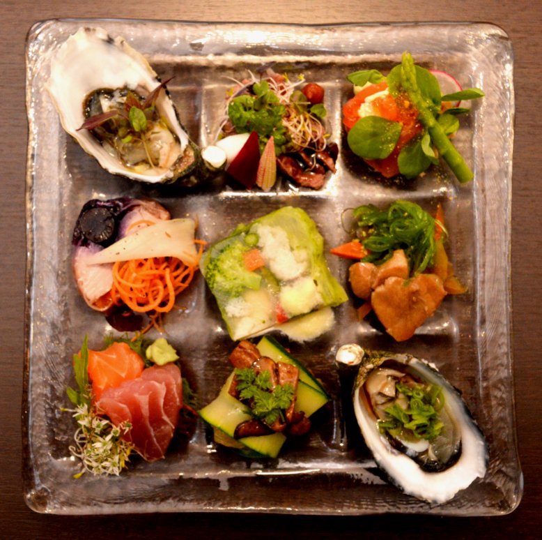 The first entree to come out was the Miyako Hors D’Ouevre Platter. The dish consisted of 9 entrees which were (starting from the centre, moving to the left and then moving clockwise) vegetable terrine, rabbit terrine, oyster ponzu, venison tataki, smoked salmon & asparagus salad, duck ham & fennel pickles, oyster yuzu chilli, vegetable tartare and salmon & tuna sashimi.