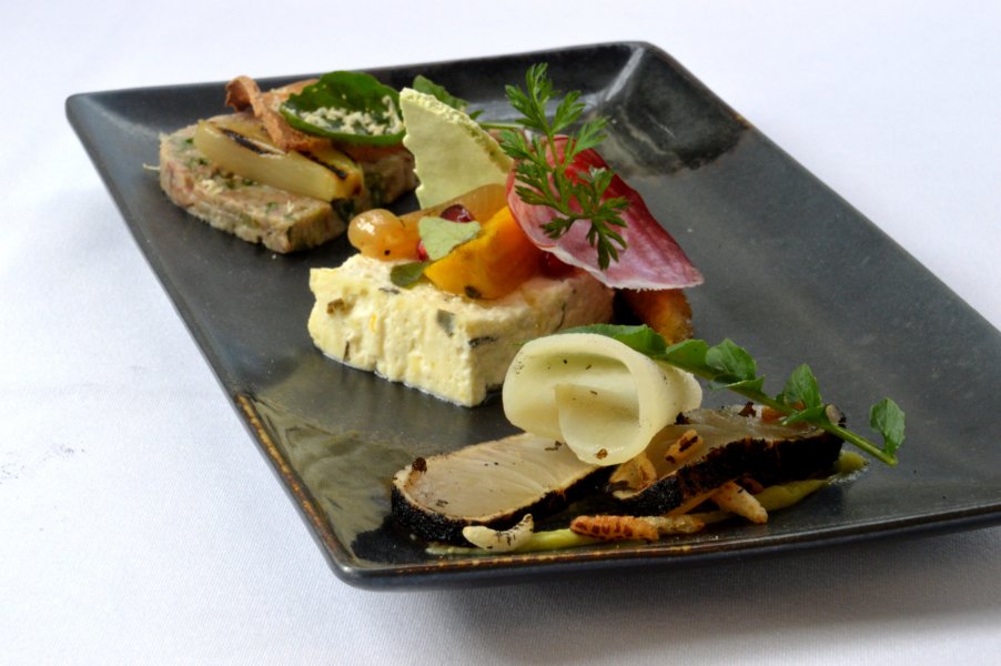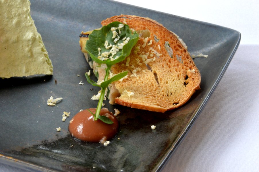 The Entree Tasting Plate consisted of (top to bottom) Pork Head and Horseradish Terrine, Baked Ricotta and Woodside Goats Curd, and Seared Hiramasa Kingfish.