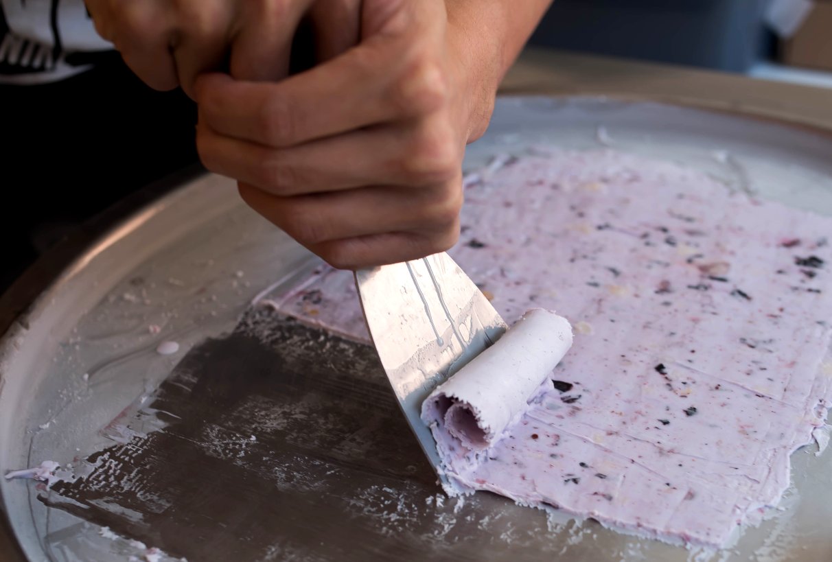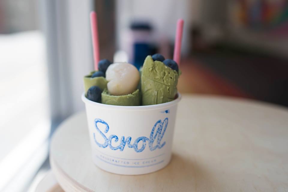 The concept behind Scroll was initially inspired by Thai street vendors during a holiday to Phuket. This Thai-inspired technique involves pouring a predominantly milk and cream-based liquid mixture onto a large, flat cold metal plate (around -20°C), mixing in a variety of chopped ingredients before spreading it thin like a pancake and finally, as the name suggests, rolling it up into delicate ice cream scrolls. All of this is carried out right in front of you using flat spatulas just like you’d see at a typical Teppanyaki restaurant. The scrolls are then topped with delicious treats like fresh fruit, crushed biscuits and nuts or wafer sticks. Each ice cream is prepared using fresh local ingredients, with the team at Scroll priding themselves on their ice cream being preservative and stabiliser-free.