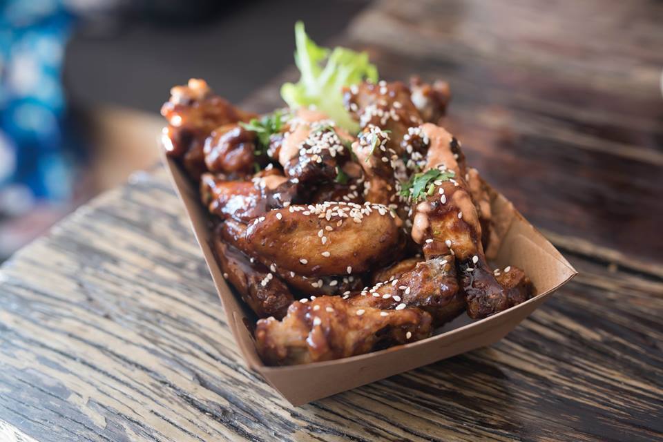 As if eating a giant burger isn’t enough we decided to begin our feast by ordering a few side dishes (or ‘Quick Fix’ as the menu reads). We opted for the Onion Rings and Sweet Chipotle Nomix Chicken Wings. The onion rings arrived after a few short minutes and were beautifully presented, despite being served in a cardboard box, with a wooden skewer cleverly used to stack the onion rings higher; somewhat reminiscent of the ‘Hoopla’ game you would play at a fair. The onion rings were golden in colour and had a perfect crunch to them, which complemented the soft onion on the inside of the batter. The onion rings were paired with a garlic aioli, which was creamy and not too garlicky.