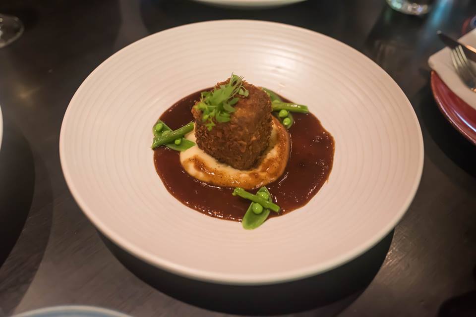 The first entree was the Cubique De L’Agneau. This was a pulled lamb shank with sugar snap peas and chervil lamb reduction on a potato puree. Inside the dark, golden brown exterior were compressed chunks of well seasoned lamb. The meat was tender and succulent, and easily fell apart. The potato puree was soft and creamy, and soaked up the beautiful flavours of the lamb reduction.