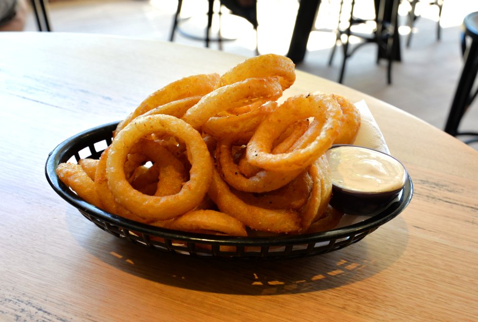 Given that The Pickled Duck’s menu focuses on burgers and pizzas of course we were going to order a burger, but first things first. To accompany our burgers we decided on a serve of Onion Rings from the ‘Small Eats’ menu and the Loaded Potato Skins. The Onion Rings were served with chipotle mayo and had a perfect golden colour with an even more perfect crunch. The serving size was generous and the rings were equally good to eat with or without the subtly spiced chipotle mayo. The batter was used sparingly (in a good way) which meant the onion rings were a nice ‘light’ snack that wasn’t oily and didn’t fill you up (too much).