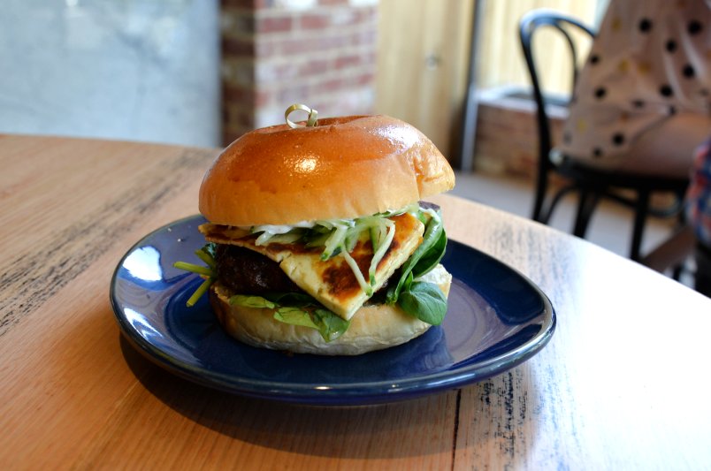 I opted for the Middle Eastern Lamb Burger consisting of a lamb patty, grilled haloumi, cucumber, hummus, baby spinach and minted yoghurt. Whilst I found the lamb patty a tad overcooked the flavours worked flawlessly together. I loved the squeak of the haloumi every time I took a bite and I should point out that there was plenty of haloumi, no skimping in this burger. I also liked the fact that the cucumber was finely grated opposed to sliced; the latter of which making for a somewhat cumbersome burger to eat. The minted yoghurt added a refreshing hit to the burger and complemented not only the lamb but the nutty flavour of the hummus, which in itself was a nice alternative to a sauce or relish that are commonly used in burgers.