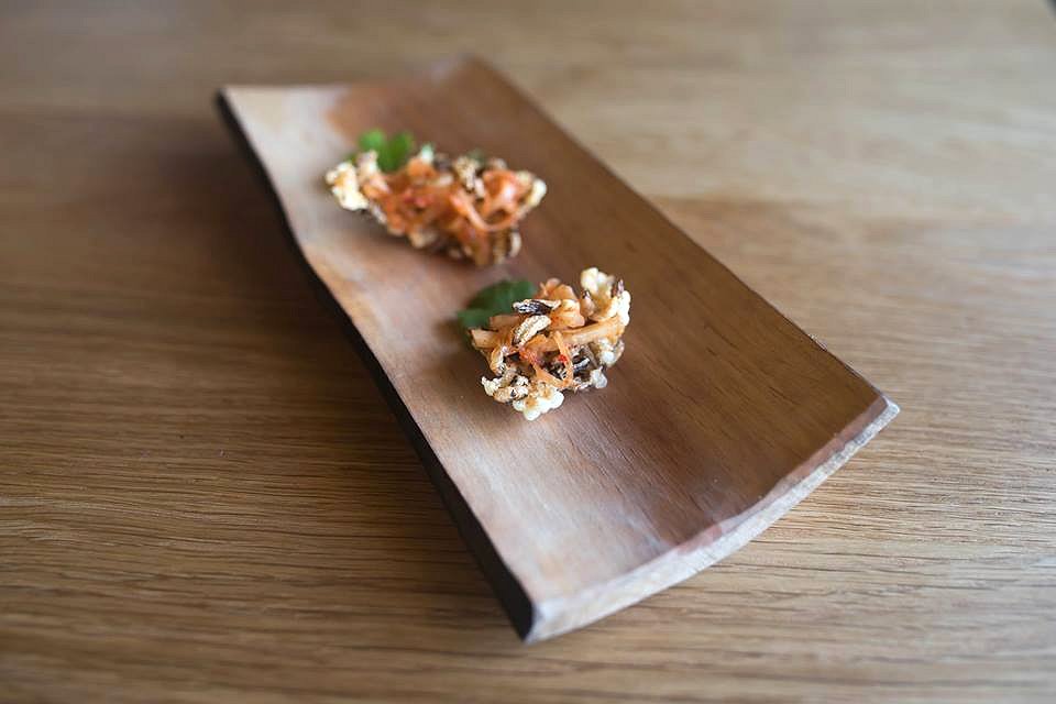 As we settled in we were presented with some tasty, bite sized morsels to get our mouth watering. The Snapper on Potato Crisps was the right combination of salty and sweet and the Puffed Rice with Homemade Kimchi had a great bite and was all the more enjoyed, knowing it was made from ingredients in their garden.