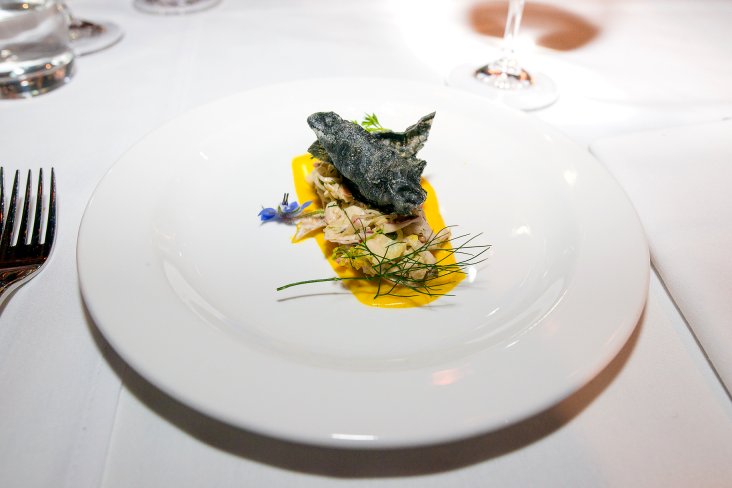The next pairing was Jeffrey Grosset from Grosset Wines (Clare Valley) with his 2015 Polish Hill Riesling and Paul Baker from Botanic Gardens Restaurant. Paul created what he referred to as his “favourite dish”; Tommy ruff escabeche with Kinkawooka mussel custard, fennel remoulade and squid ink cracker. Paul told us how he aimed to connect the Botanic Gardens with two of his favourite South Australian ingredients, the humble herring and mussel. I would have to say that this course was one of my favourite pairings of the night! The Tommy ruff escabeche was light, fresh and had a lovely sweetness that complemented the creamy mussel custard and fennel remoulade. The squid ink cracker added a visual and textural contrast.