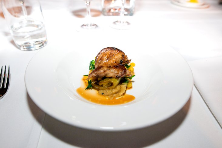 Duncan Welgemoed from Africola created what he described as a “rustic and tasty” dish comprised of Charcoal Savannah Farm chicken hearts with mielies and marjoram to match the 2014 Old MacDonald Grenache hosted by Stephen Pannell from S.C. Pannell Wines (McLaren Vale). Now after reading chicken hearts on the menu I was rather sceptical about trying what the lady next to me described as “just another muscle”. As a scientist I just couldn’t bring myself to try the chicken hearts, which reminded me all too much of my day job. I did, however, overhear some guests saying the chicken hearts were a tad spicy to pair with the Grenache, but delicious by others; definitely a combination that split the table. What I did love about this dish was the creamy mielie-meal purée that tasted just like creamed corn at the base, but I found the marjoram too overpowering.