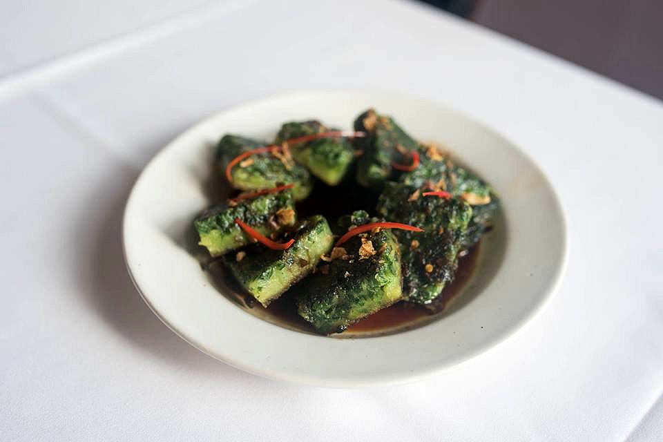 The Chive Cakes with dark soy, vinegar and chilli was paired with Not Your Grandmas Riesling Eden Valley 2016. The Chive Cakes remind us of a popular Vietnamese dish with the exception of the green colour. The cake is firm and chewy, and balanced by the spicy sauce that it swims in. The taste of apple and lime in the riesling create balance with this dish.