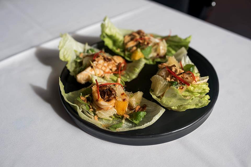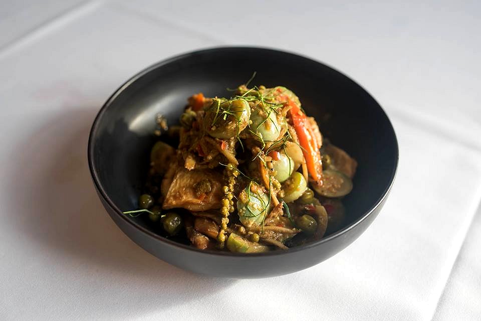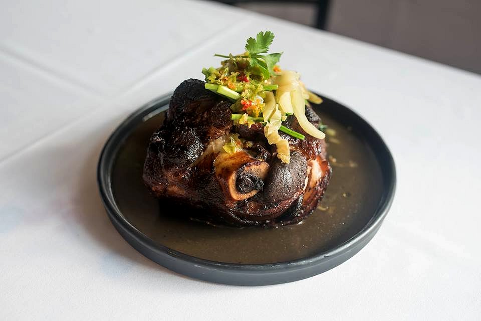 The Fresh Pomelo Salad is served with fresh chilli dressing and South Australian squid. Served like a San Choy Bow, the lettuce leaf is used as a cup to hold all the ingredients. The squid was well seasoned and cooked to perfection. The spicy chilli dressing was balanced by the sweetness of the pomelo, and crispy texture of the fried onions worked well with the lettuce leaf. Paired with the Kontrapunkt Eden Valley Single Vineyard Kerner 2015, the pear, peach and citrus notes complement the sweetness of the pomelo perfectly.