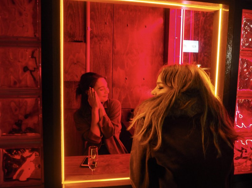 The minimalist signage of the bar gives it a hidden, underground vibe but is contrasted beautifully with a large pink neon sign at the front entrance.