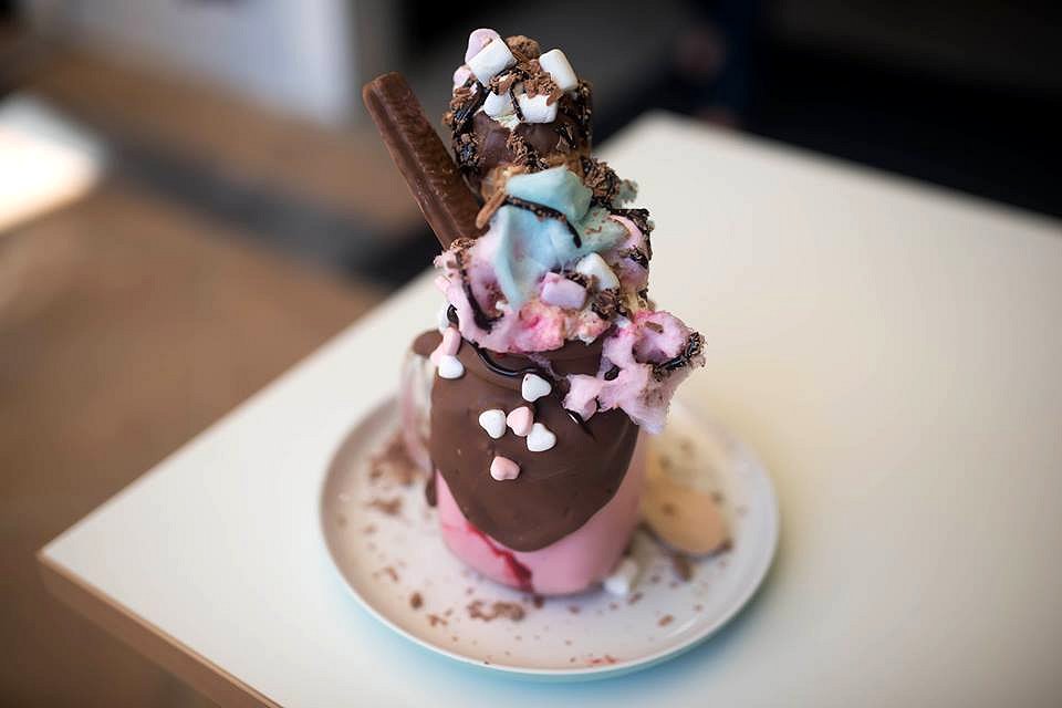 On a sugar high, we washed the first dessert down with the Overload Epic Shake. This is a strawberry shake with a waffle cone, fairy floss, biscuits, marshmallows and chocolate surprise. Apart from the beautiful presentation, this epic shake has all my favourite sweets in the one place. The fairy floss and marshmallows are great to nibble on, while the waffle cone and biscuits add a crunchy texture to the shake. When you get down into the jar, you’ll be amazed to find the shake actually tastes like strawberry and not just milk! Impressed and satisfied!