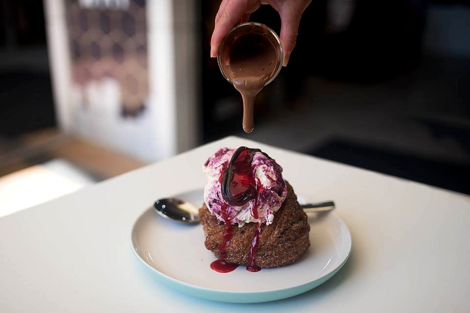 Let’s not kid ourselves as to why we’re really here. The cafe specialises in desserts so let’s put them to the test. First up was Little Miss K’s Lava Mountain; An Italian donut with berry ice cream, berry coulie, chocolate fudge and pure warm milk chocolate. The donut is coated in cinammon sugar, crispy on the outside, and light and airy in the centre. The sweetness mainly comes from the berry flavoured ice cream and coulie, and the taste reminded me of an upmarket jam donut. The warm milk chocolate adds a temperature contrast to the dessert, and all the elements work spectacularly well.