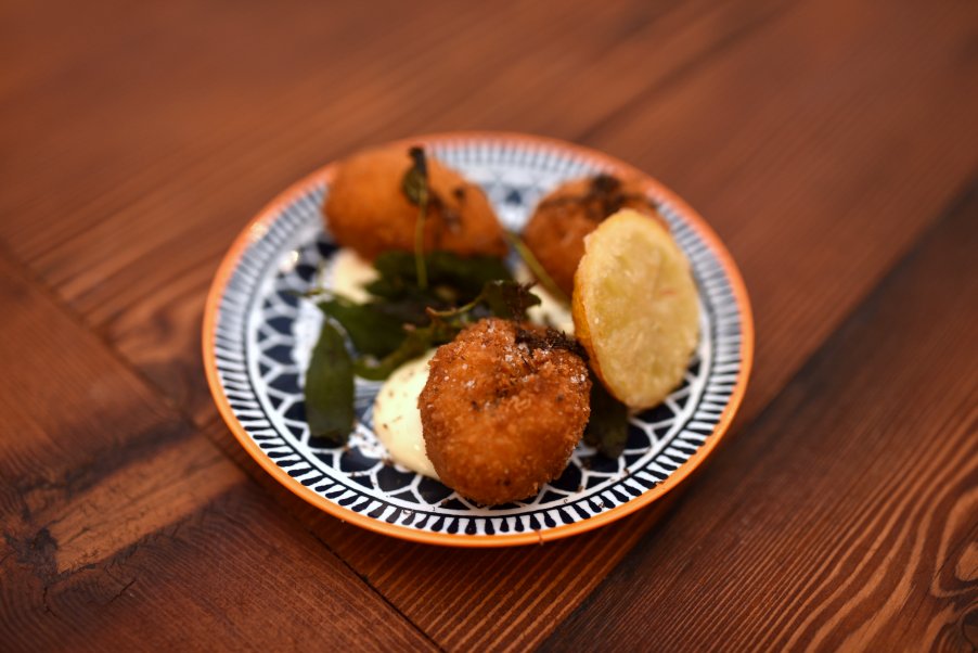 The ‘smaller’ plates are where the menu really hits its stride. Saganaki Fried Cheese presented in a cast iron skillet fried with organic honey, gives a delightful sweet dimension this salty favourite. A plate of Croquettas placed on the table brings the delectable fragrance of truffle with them. Each parcel has a crisp, golden casing and a pillowy soft filling flavoured with porcini and the anticipated truffle.