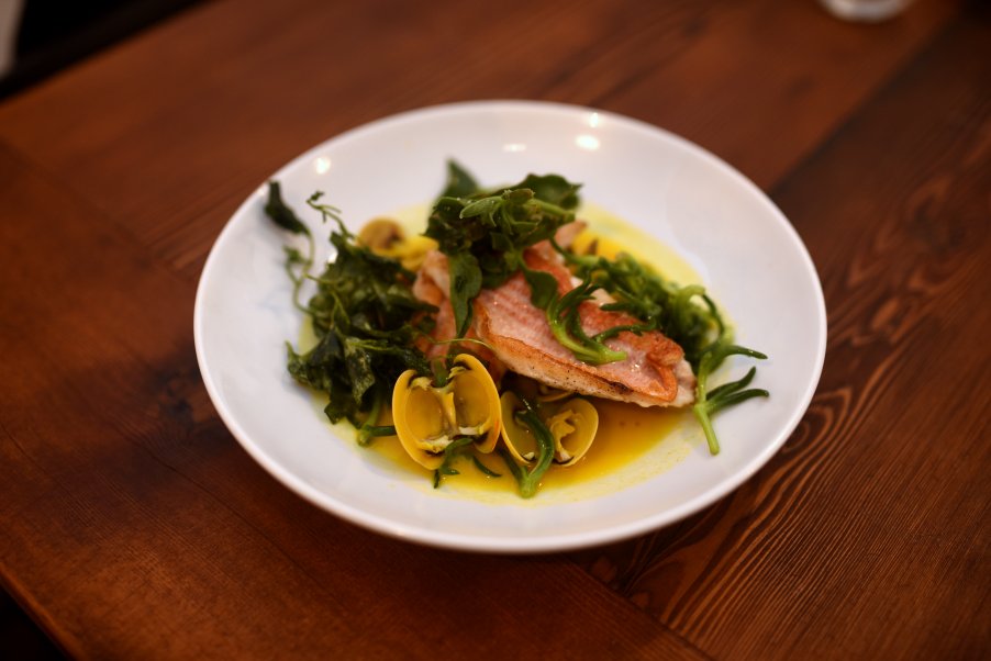 The larger plates feature bold and comforting flavours. A Housemade Pappardelle, thick ribbons of pasta stirred through chunks of tender slow cooked beef short rib, topped with parmesan and crispy sage; sliced Black Angus Steak dolloped with creamy béarnaise, accompanied by thick chips; Snapper and Clams in saffron broth evoked flavours of the sea with its unusual inclusion of sea vegetables.