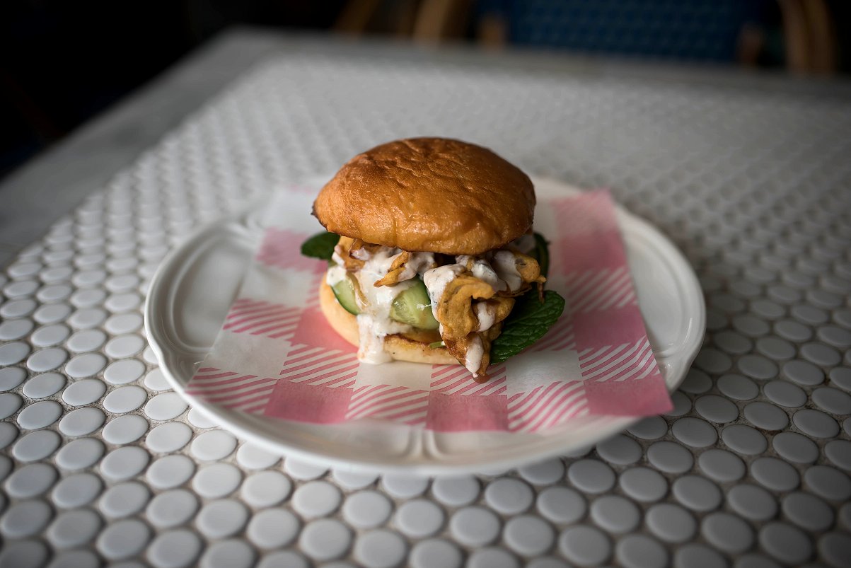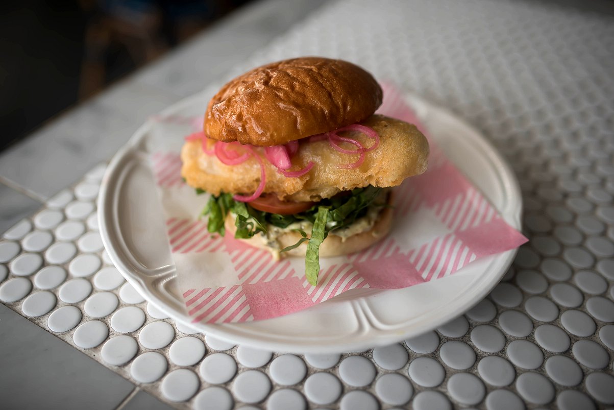 The Fish Burger is a generous portion of fluffy flake in a crisp and golden batter accompanied by shredded iceberg lettuce and thin slices of tomato. What else would you expect in a fish burger than a dollop of tartar sauce; this one is tangy and studded with capers.