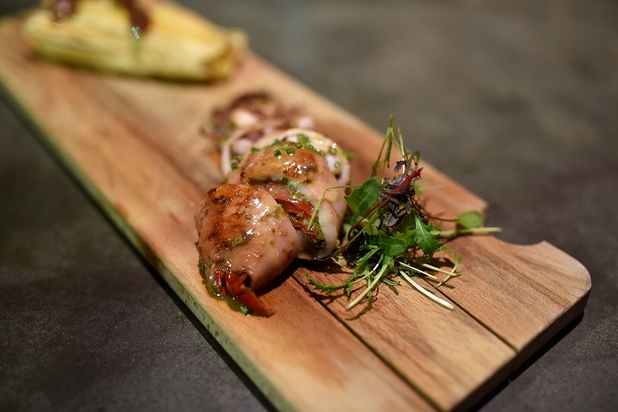 First up was the Chargrilled Squid. The presentation was interesting as the squid legs were stuffed inside its own body. The squid was soft and delicate with lovely smokey flavours. The dish was served with The Swindler Summer Ale which had pear and watermelon characteristics. The contrast in flavours made this pairing work.
