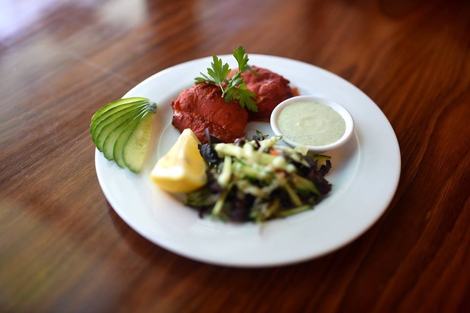 Unable to decide on an entrée from the many offerings we went with the tasting plate featuring four of the classic starters, Varanasi Samosa, Onion Bhajia, Chicken Tikka and Mustard Fish Tikka. All served with a mint and tamarind chutney.
