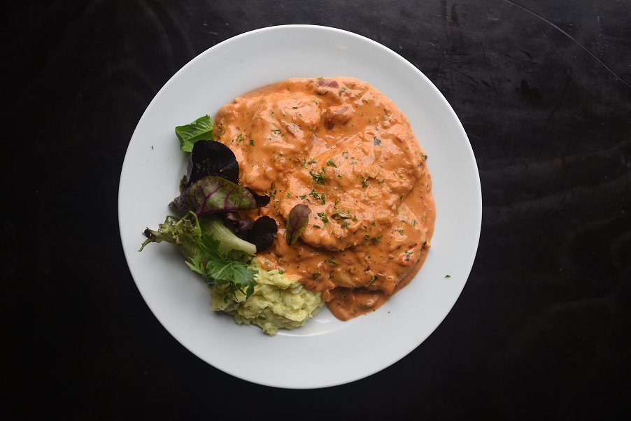 Finally, we tried one of the menu favourites – Chicken Rossano. Chicken pieces crusted in parmesan cheese in a rose sauce with a side of garlic mash. This is not your typical just-detectable hint of roasted garlic, garlic mash. This is creamy, smooth, vampire repelling garlic mash! Despite the garlic being very strong it doesn’t have a raw pungency that burns the mouth. I loved it – the person sitting next to me on the bus on the way home may not have!