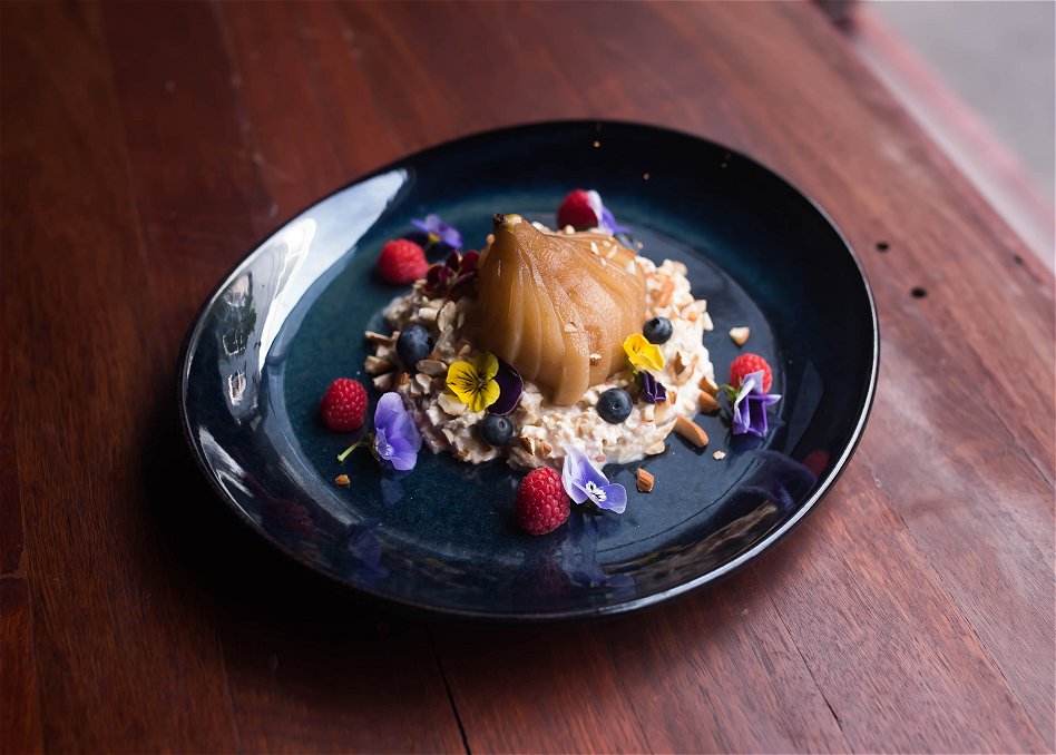 We start off with the Bircher Muesli which is mixed with a bio-organic yoghurt. The rolled oats are softened by the apple juice, and it works well with the smooth, creamy texture of the yoghurt. The raspberries and blueberries add a lovely natural sweetness, as does the poached pear, which has a mild tea flavour.