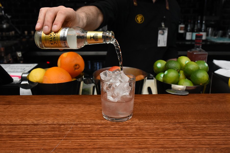 Fig & Tonic is an elaborate twist on the faithful G&T, combining and earthy fig infused gin with tonic and garnishing with a basil leaf. A divine blush colour this refreshing has medicinal notes similar to a maraschino drink.