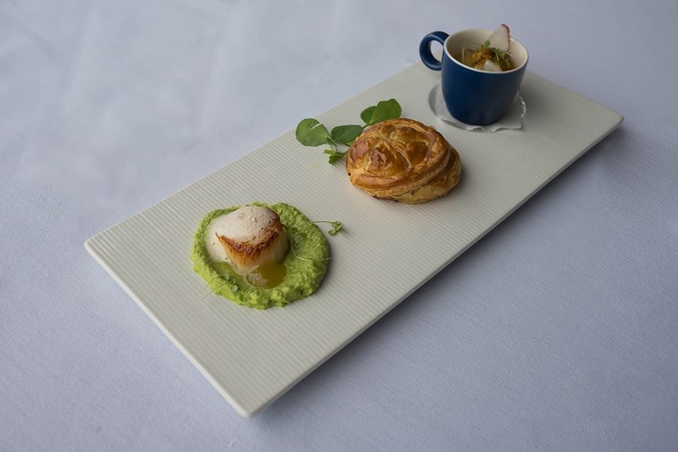 Festival of Food diners get the Entree Tasting Plate. At the top is the Cauliflower and Fennel Soup. A smooth creamy soup, thick in consistency with delicate flavours. In the middle is the Chicken and Sweet Corn Pie. The flaky pastry was cooked to a beautiful golden brown and filled with a tried and true combination. At the bottom is the Scallop with pea puree and mustard fruits. A single perfectly cooked scallop sits on a small bed of puree with its flavour accentuated by the small dollop of mustard fruit.