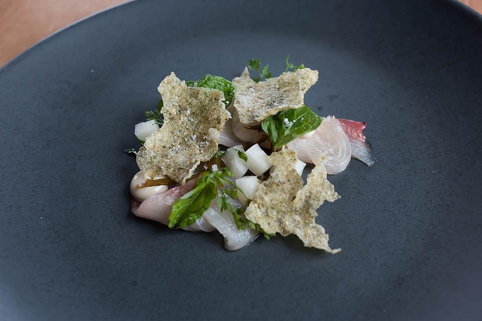 We start with a young 2016 Orlando St. Helga Riesling with Smoked kingfish, oyster cream, kohlrabi salsa, and wakame crackers. The pronounced lime flavour in the dish does not dominate the delicate kingfish curls. Oyster mayonnaise adds richness without being fishy or over powering and the pressed brown rice and wakame crackers add a desired crunch while providing the seaweed hint that has repeatedly been found to pair extremely well with Riesling. We discover that it indeed does.