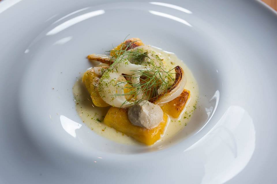 We move onto a 2014 St Hugo Signature Grenache Shiraz Mataro that proved to pair extremely well with yoghurt. Inspired by this match a Ricotta Gnocchi and whey butter sauce capitalize on this flavour and labneh adds another sour note mixed in with eggplant. Golden beets provide an earthy, sweet contrast. There is no doubt that fennel came up trumps in the flavour testing. Here we see a multidimensional use of fennel including sliced fresh shards, fennel tips, granulated fennel salt and an expressive confit of fennel that has been cooked in whey.