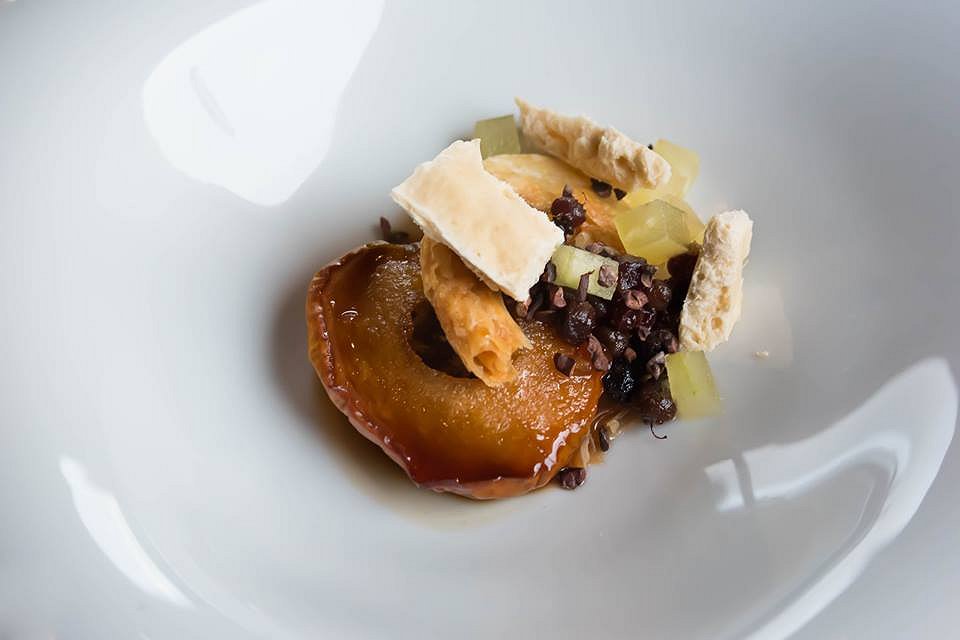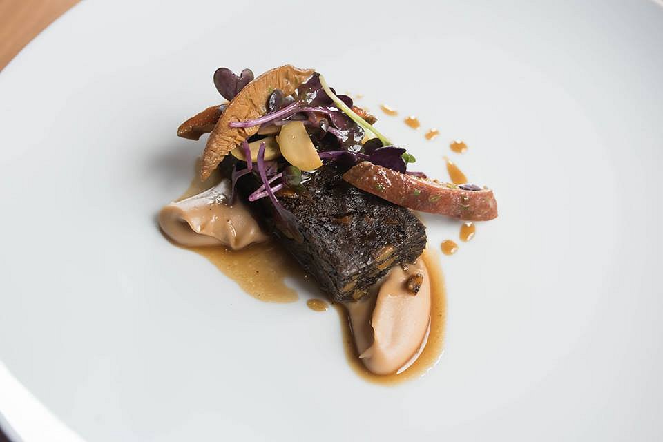 A non-traditional Black Pudding is served with a 2012 St Hugo Private Collection Seppeltsfield Shiraz. In contrast to the typical dense, hearty pudding this pudding has a light airy texture. It possesses a familiar consistency that I am unable to put my finger on until told the pudding is bound with blended chickpeas – the texture is falafel like. A butter sauce that has been infused with coffee beans is drizzled over the venison pudding which is topped with fresh picked pine mushrooms. Finished with velvety smooth chestnut puree with a rich premium wine this woodlands style dish was perfection on a rainy, cold day.