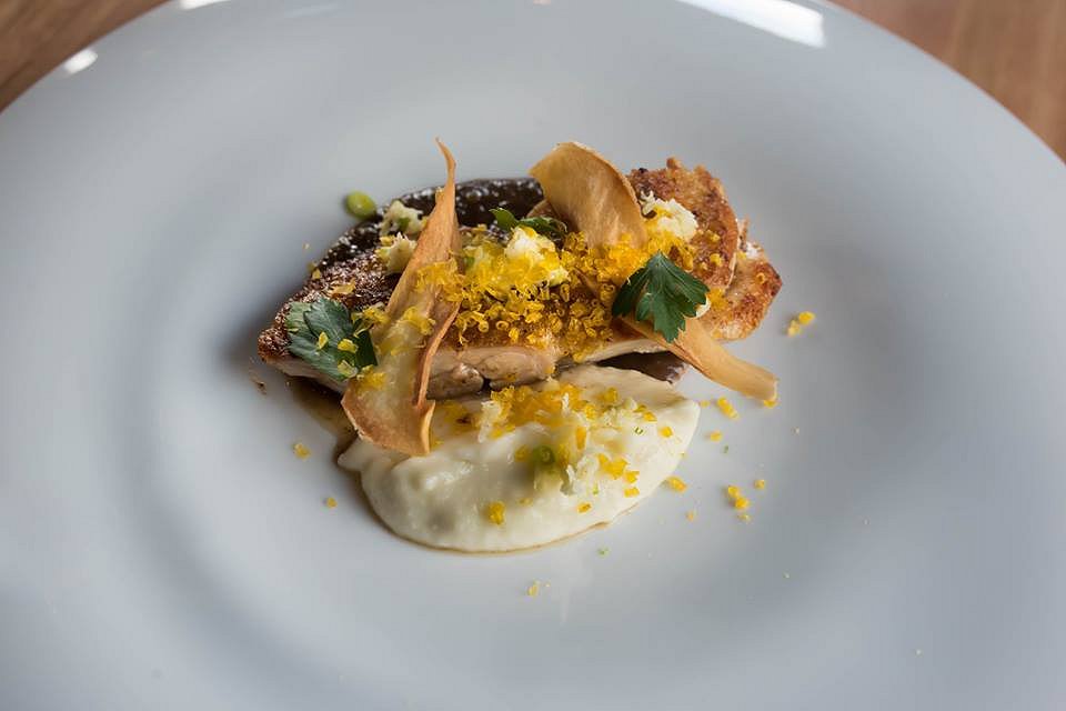 A serve of juicy, roasted deboned Spatchcock has crisp golden skin that has a wonderful saltiness. What sits under the poultry is somewhat of a ying yang- in appearance as well as taste. To the left is a soft, stark white polenta that is airy, light and creamy. To the right is a puree of black bean, rich, hearty and earthy. The juxtaposition of flavour and texture resulted in a delightful and exciting contrast when eaten with the meat. The 2008 St Hugo Signature Cabernet Sauvignon also played with both flavours. The wine has proved to pair well with parsnip so we have the addition of crispy parsnip chips on top and a finale of grated salted egg.