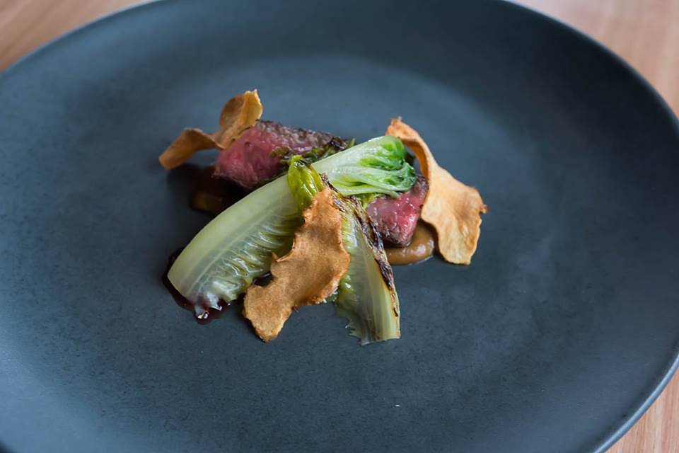 I can assure you that this stunning pink slice of Seared Wagyu tastes as good as it looks. The slice of oyster blade is presented with charred cos as bitter greens scored well with the 2010 St Hugo Vetus Purum Shiraz. The beef is underpinned with a caramelized onion soubise that is sweet and velvety and marries with the tender beef. For textural contrast we are given supremely crunchy jeruselum artichoke chips that give an audible snap when bitten.