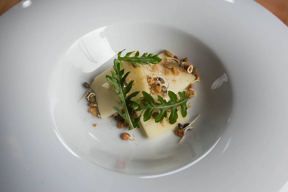 Our cheese course comprises of a French Ewes Milk Cheese that has matured for 12 months with a 2009 St Hugo Shiraz Cabernet Sauvignon. A ‘Granola’ of barley and two types of lentils provide outstanding crunch with the semi-hard cheese. Shaved over the top is a light zest of lemon and shavings of locally sourced acorn. The acorn really pumps up the crunch factor which is countered with a soy crème. A few immaculate rocket leaves complete the dish by adding freshness.