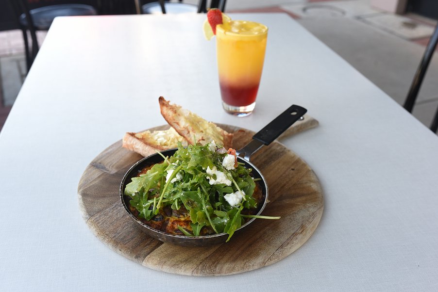 We started with the Mediterranean Omelette with chorizo, spinach, mushrooms, olives, tomatoes and parmesan. Served in a cute little frying pan, we couldn’t wait to dig into this dish, and neither did the hungry magpie that was flying around. The omelette was light and fluffy, and covered the base of the pan. The pieces of chorizo had a lovely smokey flavour, while the mushrooms brought earthiness to the dish. The generous amount of rocket was fresh and crisp, and the crumbly feta added a burst of saltiness with each bite. Absolutely delicious and a perfect way to start off proceedings.
