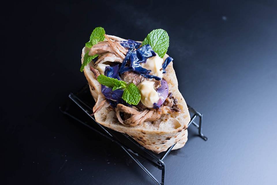 For the first Pizza Pocket… Pulled Pork! The Pulled Pork inside has a slight smokiness to it, and is tender, succulent and easily falls apart. The red cabbage in the dish adds a needed depth of crunch to the pocket, topped with light and refreshing mint.