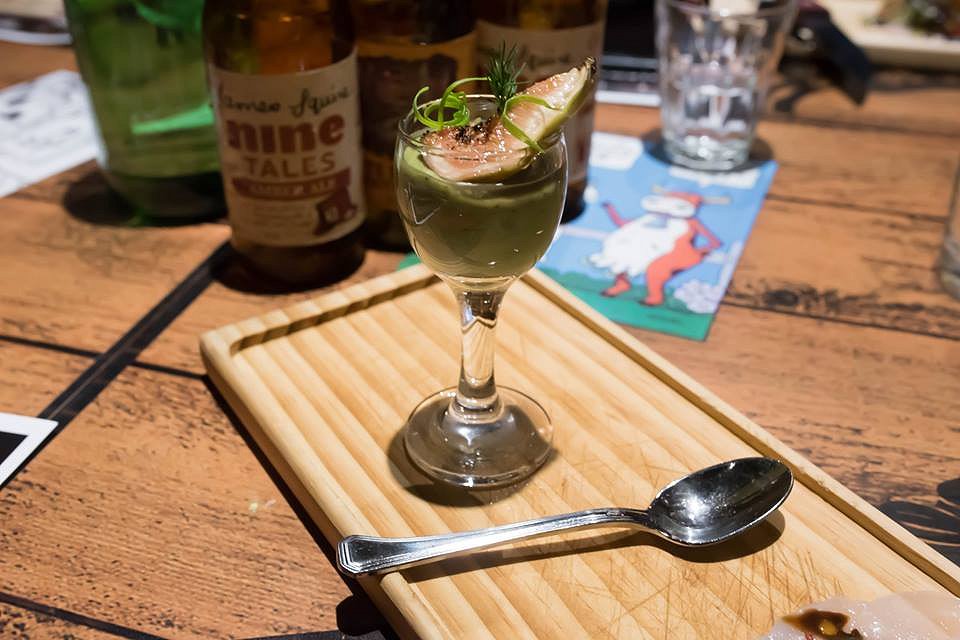 We started off with a Creamy Avocado Soup with candied fig served with White Rabbit White Ale. The soup was smooth and creamy, and really worked well with the notes of coriander and juniper in the White Ale.