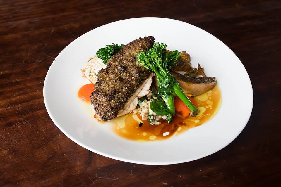 Herbed Crusted Chicken Breast – a beautiful serving of chicken breast is heavily topped with a herb crusted layer. Sweet pumpkin adorns the plate next to a swipe of mandarin gel, all enjoyed with butter and sage fregola.