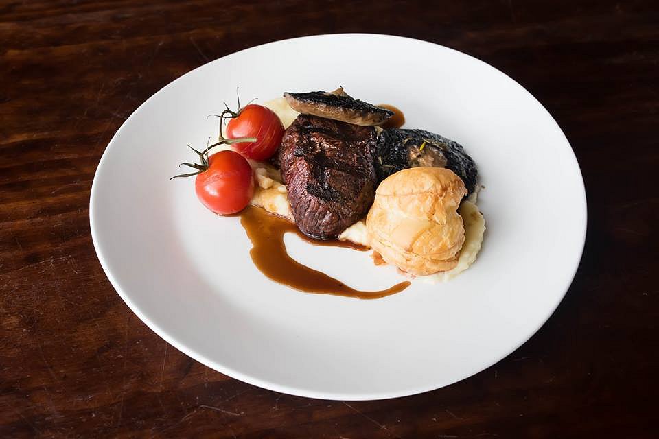 Fillet of Beef – a perfect pink-red centre combines flawlessly with the charred smoky flavours of the beefs exterior. The medium-rare masterpiece is presented with a slightly granular yet smooth and buttery mashed potato, field mushrooms, blistered cherry tomatoes and a classic pastry puff. The perfect comfort food option for a winter warmer!