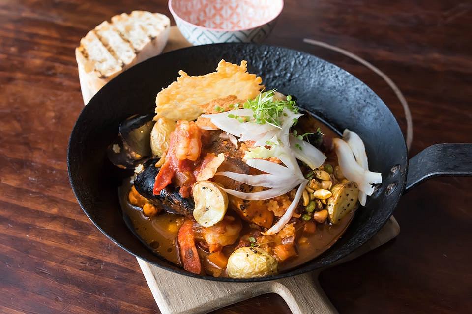 Kingfish – This galaxy of seafood brings new flavours to your palette with every bite. Sitting in a broth of mixed seafood tastes, this kingfish dish combines soft potatoes, star pasta, prawns, mussels and crackers of parmesan to the rustic skillet. Topped with crunchy peanuts, the fish is perfectly cooked and a highly recommended menu item to try.