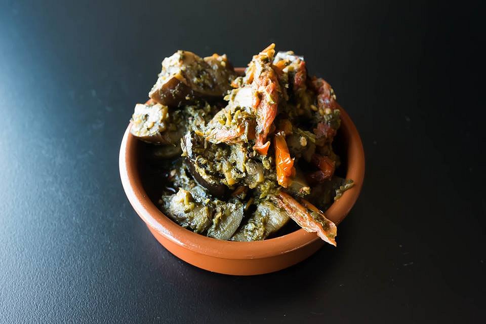 Grilled Aubergine with Green Chermoula Marinade – the soft and delicate eggplant in this dish has a distinct earthy palate that beautifully balances with the sweetness of the semi sundried tomatoes.