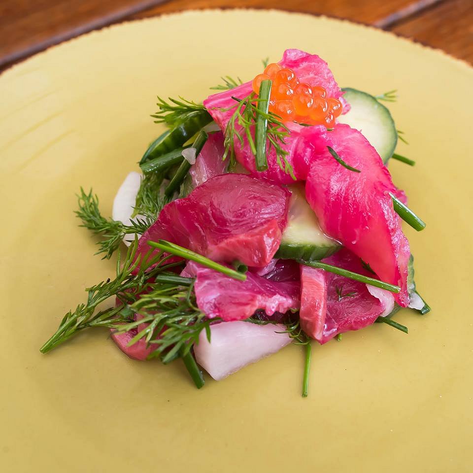 Next was the gorgeously presented Beetroot Cured Hiramasa Kingfish with pickled cucumber and radish, salmon row, dill and chive. The Kingfish has a silky smooth texture complemented by the tanginess of the pickled radish and beetroot. The salmon roe added a touch of saltiness to the light and fresh meal; all paired with a summer fruits and creamy cashew 2016 Bird in Hand Chardonnay.