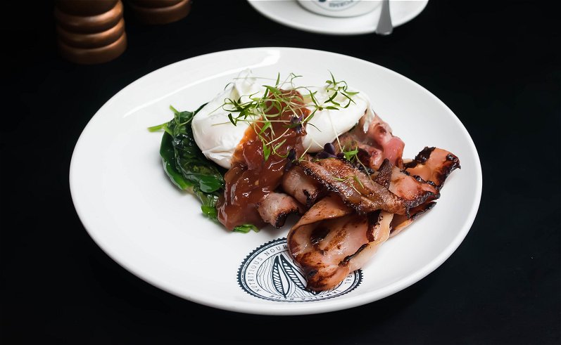 Breakfast Potato Hash – Rich gooey soft poached eggs top perfectly cooked bacon for the ultimate breakfast combo. Served with a delicious sweet tomato chutney and spinach all over a pancake textured potato hash, this incredible mixture of brekkie foods is one to try!