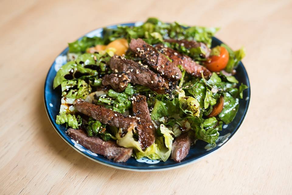 Coffee Beef Salad with coffee seasoned scotch fillet, cos, mint, tomato, melon, daikon, shallot, black bean dressing and Hawaiian dukkha – This gluten free salad is the salad of salads. People always say ‘you don’t make friends with salad’, but they’ve obviously never had this Coffee Beef Salad. Tender grilled, coffee seasoned beef, is tossed with salad greens, coated in a delicious black bean dressing and sits on a nice surprise of sushi rice which is the perfect touch to the dish. Coffee is an unusual ingredient in salad, and in savoury cooking in general, however the flavour is subtle and is not overpoweringly bitter – as might be your preconception. The rockmelon provides a refreshing Hawaiian edge, which is perfect with the black bean dressing.