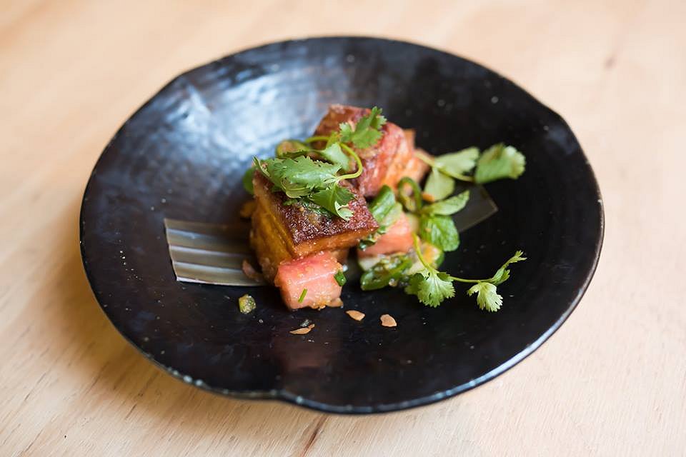 Luau Pork Belly, crispy pork belly with passionfruit glaze on a banana leaf with green chilli, watermelon, apple soy sauce, cilantro, coconut chips and mint – Another gluten free option has snuck into our review with sensational feedback. The naming of the dish is incredibly appropriate, with a Luau being a Hawaiian feast in which pork is often the featured meal. The slow and twice cooked pork is thick, fatty and crunchy, and melts in your mouth with absolute perfection – all the qualities you look for in a good pork belly. Cubes of watermelon, an unlikely accompaniment, cuts through the saltiness of the dish and – to my astonishment – pair really well. The passionfruit glaze provides a hint of tartness, making the dish salty, sweet and tart.